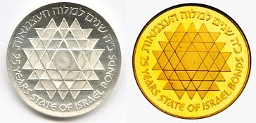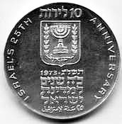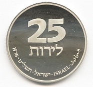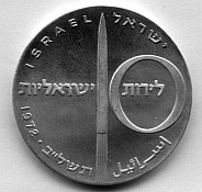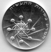 The coin's obverse shows a representation of a cog wheel rotating a molecule slightly off-center, conveying the impression of motion. The motto of the 23rd Anniversary of Independence coin, "Science in the Service of Industry" appears above the image. On the reverse is a stylized design of the dome of the nuclear reactor at Soreq. The silver BU coin was issued in two versions. One variety has no mintmark, whereas the other has a small Star of David mintmark on its reverse, left of the nuclear reactor, just above its base. Unconventionally, the silver Proof coin has a mintmark in exactly the opposite place on the obverse, a small 'Mem' at the right side of the nuclear reactor, just above its base. |