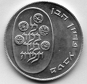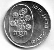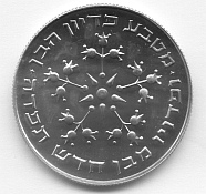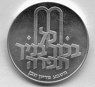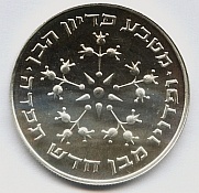 The obverse of the 1978/5739 Hanukka coin shows on its obverse a Hanukka Lamp from France. This lamp, one of the oldest known specimens, is now part of the Israel Museum collection in Jerusalem. It was crafted by a Jewish-French silversmith in the 14th century. The design on the triangular back panel is somewhat reminiscent of the façade of a gothic cathedral with twelve gates, apparently symbolic of the gates of the Temple of Jerusalem and the Twelve Tribes of Israel. |