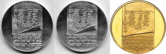 The silver BU coin has a small Star of David mintmark, and both the silver and gold Proof coins a small 'Mem' mintmark, situated just above the bottom edge of the coins' reverse. |