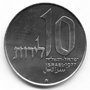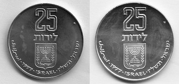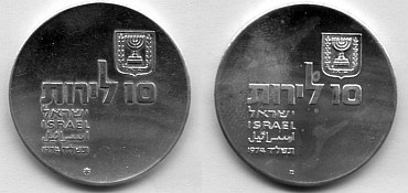 This Hanukka Lamp, as depicted on the obverse of the 1977/5738 Hanukka coin, originates from Jerusalem, and is now housed in the Eretz Israel Museum in Tel Aviv. The lamp was designed in the beginning of the 20th century. A legend in silver lettering on brass reads: "This is the Lamp of the house of Rifkah Fardis, Jerusalem." The lamp is in a panel, the upper part has a Star of David embossed, and from within, on a copper background the word "Zion" in silver. On the foreground is a tin strip in the shape of a semicircle, containing eight depressions to hold the oil containers. The Proof version comes in two varieties: The most common variety has an open 'Mem' mintmark, and the somewhat lesser abundant type has a closed square 'Mem'. |