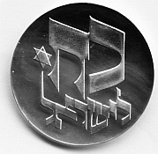 The Hanukka Lamp depicted on the obverse of the 1979/5740 Hanukka coin is from Egypt and dates from the 19th century. On the triangular panel one can easily discern the influence of a Gothic-Italian lamp from the 15th century. The passage engraved on the lamp, "For the commandment is a lamp, and the teaching is light" (Proverbs 6:23), is appropriate to the Festival of Lights, and thus it was interpreted by the sages in the Talmud (Megilah). This Hanukka Lamp appears in a shallow depression in the form of a Star of David. From the corners three blossoms emerge and in the middle a miniature Star of David. Below the Star of David is the biblical passage. |