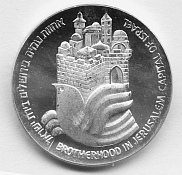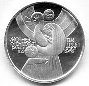 The 31st Anniversary of Independence coin is dedicated to motherhood, and the pivotal role played by the mother in the Jewish home. On the coin's obverse appears a figure of a woman at play with two children, flanked by the biblical quote "Mother of Children" (Psalm 113:9) in Hebrew and English. |