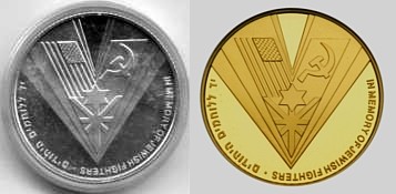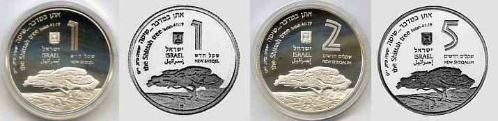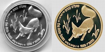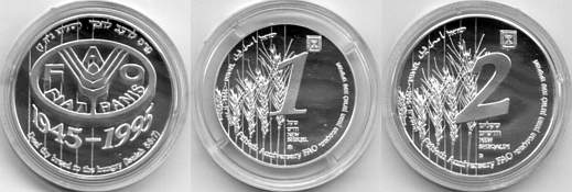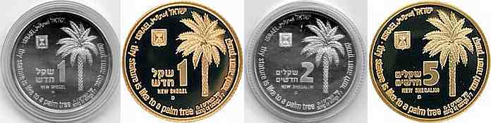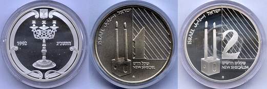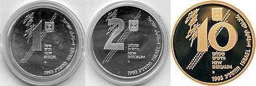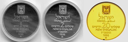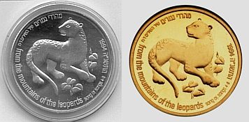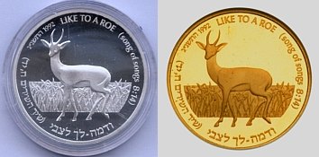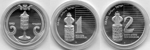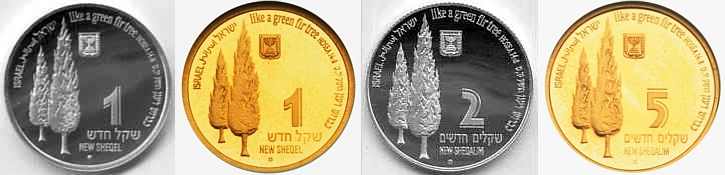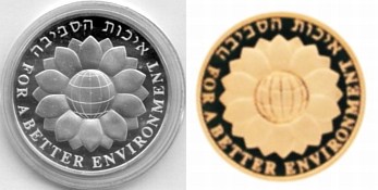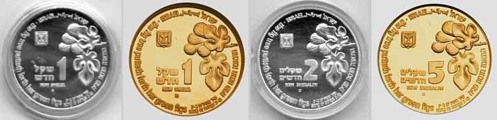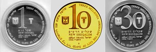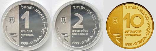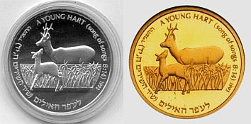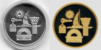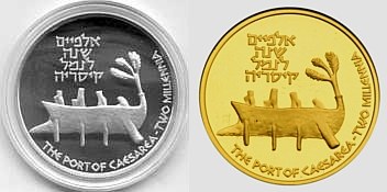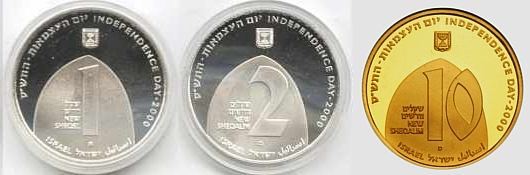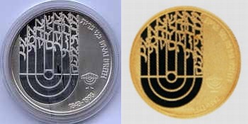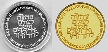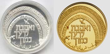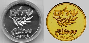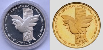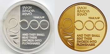 This coin, marking the millennium, depicts a gentle, stylized design of the figure 2000, incorporating a Dove and Olive Branch, symbols rooted in Biblical tradition and the Holy Land, denoting peace all over the world. The words "And they shall beat their swords into plowshares" were taken from the Book Isaiah (2:4). |