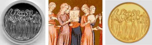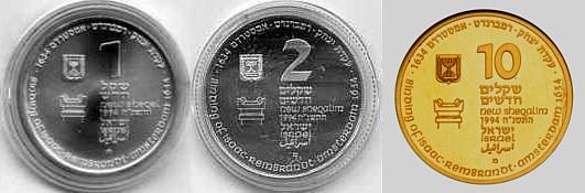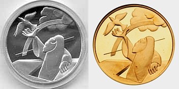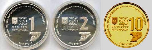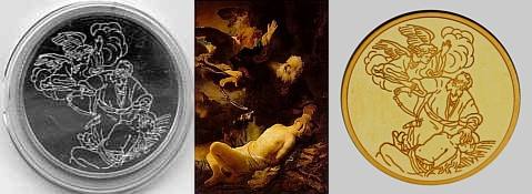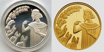 This coin features the story of Joseph and his Brothers, as told in the Book Genesis (45:1-15). Joseph was the favorite son of his father Jacob. This and his dreams aroused the jealousy of his brothers. The coin portrays the transformation of jealousy into brotherly love. The row of sheaves on the top left-hand-side of the coin turns into hands reaching out to Joseph, shown in the lower part of the coin. The image of Joseph on the right hand side, alludes both to the beginning and end of the story. The depiction of Joseph as second to Pharoah, with the jewels, is a reminder of the Egyptian mural painting style. However, the striped robe reminds us of Joseph, the boy and dreamer. The tear in his eye symbolizes the deep emotions of Joseph as he identified his brothers. |