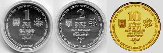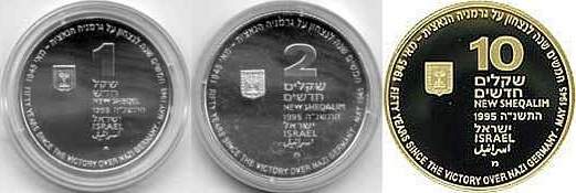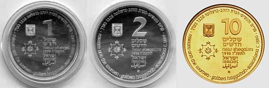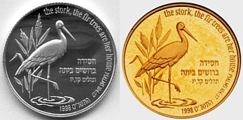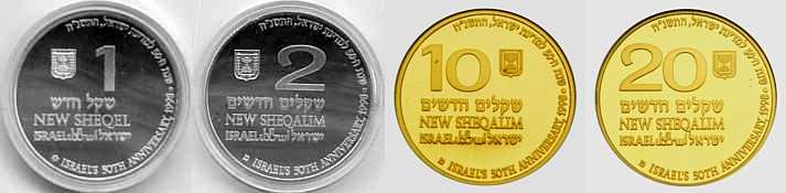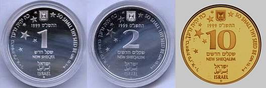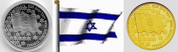 "Then shalt thou cause the trumpet of the jubile to sound on the tenth [day] of the seventh month, in the day of atonement shall ye make the trumpet sound throughout all your land. And ye shall hallow the fiftieth year, and proclaim liberty throughout [all] the land unto all the inhabitants thereof: it shall be a jubile unto you; and ye shall return every man unto his possession, and ye shall return every man unto his family. A jubile shall that fiftieth year be unto you... (Leviticus 25:9-11). In 1998 Israel celebrated its fiftieth Anniversary of Independence. The motif of the coin commemorating this milestone is Israel's flag, a blue Star of David flanked by two blue lines on a white background.