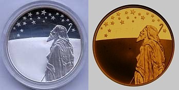 Portrayed on this coin's obverse n is Abraham, the lone shepherd, looking towards the stars, symbolizing constant divine presence in the lives of the faithful. The image captures the moment that the Lord informed him that he will be the patriarch of a great nation, comparing his offspring with the stars in heaven: "So Shall Thy Seed Be" (Genesis 15:1-6). When looking at this coin, it reminds us that the dramatic and inspirational events of the past are just as relevant now, in the era of a new millennium, as they were when they happened in the Holy Land thousands of years ago. The 21 stars on the coin allude to the start of the 21st century. |