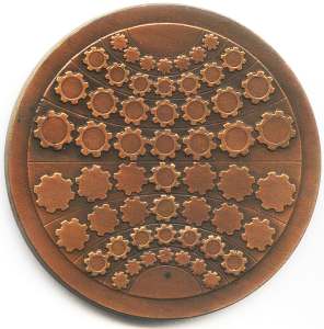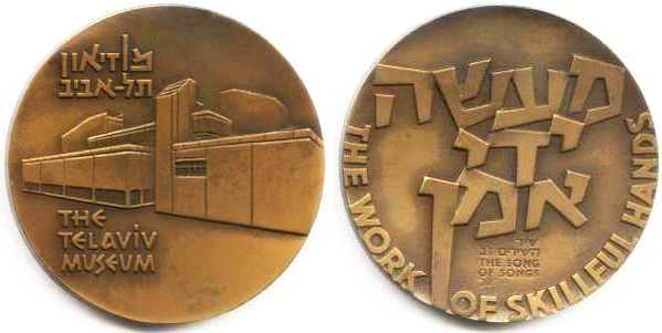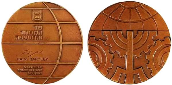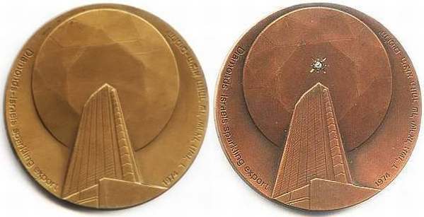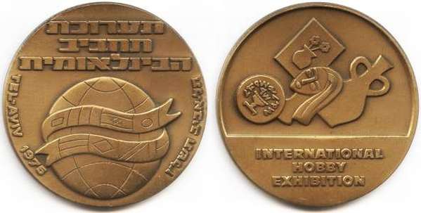 Advanced technology and improved living standards have made it possible for man to pay attention to other pursuits besides working for a living. In Israel, there are many hobbyists who present their products or collections at exhibitions. Some two hundred hobbyists participated in the 1975 show, displaying a high degree of professional and artistic skills, from painting, sculpting, copper smithing, jewelry, modeling to products fashioned out of string and matches, stamp and coin collections, etc. The obverse shows a globe covered by a ribbon showing flags, signifying the international character of the show. Above it an inscription in raised letters: "International Hobby Exhibition". On the rim on both sides an inscription: "Tel Aviv 5736" in Hebrew. The English translation has the date "1975". |