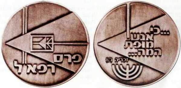 The Authority for Development of Weapons (Raphael in Hebrew) is the central research and development instrument of the Israeli defense establishment. The Authority develops sophisticated weapons by long range planning. It also is engaged in finding solutions to problems concerning day to day defense operations. The obverse has a raised triangle. On the tip, inside a rectangle, a form of a missile. On the right, below, the inscription "Raphael Prize". |