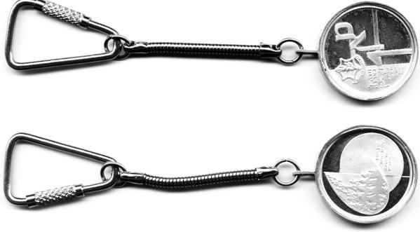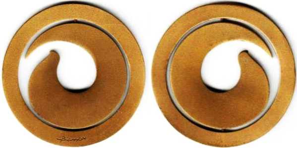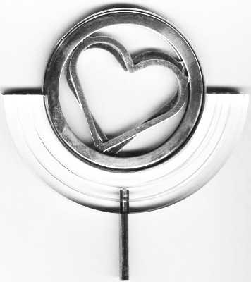 This medal is part of a series of kinetic Adillions (pendants) entitled "Movement and Change," created by the artist Nairn Basson, who specialized in kinetic art. Two hearts moving within a wheel create a variety of forms. |
