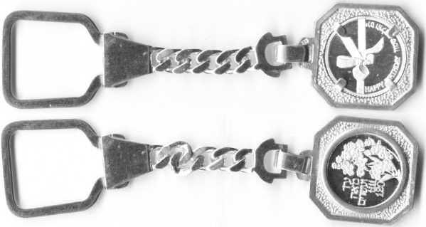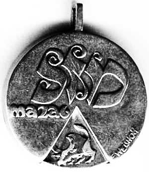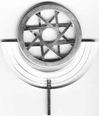 This medal is part of a series of kinetic Adillions (pendants) entitled "Movement and Change," created by the artist Nairn Basson, who specialized in kinetic art. Two 8-pointed stars move within a wheel, which, together, form an ever-changing, multi-pointed star. |