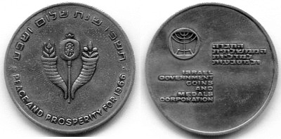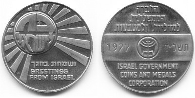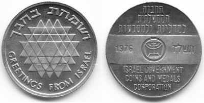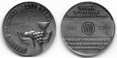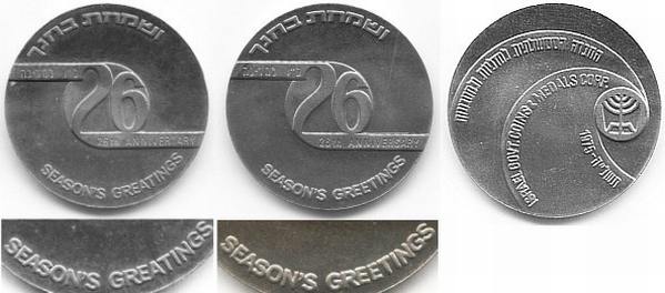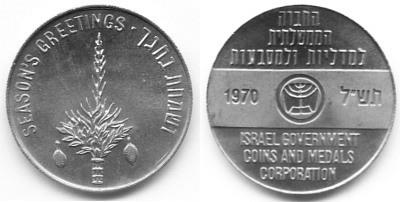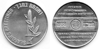 The first Season's Greetings token issued by the Israel Government Coins and Medals Corporation (IGCMC) is a 1 Agora coin encased in a 33 mm large brass frame. The brass casing is dated 5724/1964, whereas the 1 Agora coin initially used is dated 5723/1963, both the regular and inverted varieties. |