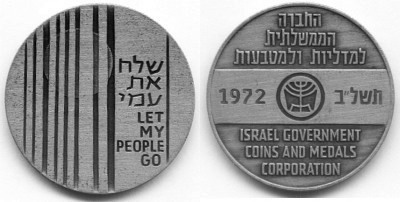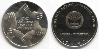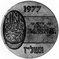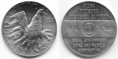 The 5766/2006 Season's Greetings token is dedicated to the 50th Anniversary of illegal immigration of Holocaust survivors during the years 1945-46. The legend on the token's obverse reads IUDAEA RESTORATA (Judea restored) and MCMXLV - MCMXLVI (1945-1946). The left structure is the Arch of Titus, symbolizing Europe and Jewish suffering during the ages. The right image symbolizes arrival in the Promised Land. Both images are separated by a wall, but simultaneously linked by the sea. The motto "Let us go up to Zion" is taken from the biblical Book Jeremiah 31:6. |