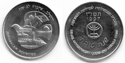 The 5757/1997 Season's Greetings token commemorates the 30th Anniversary of the reunification of Jerusalem. Within the contours of a flying dove several famous landmarks of Jerusalem are depicted, such as the Old City walls, Tower of David, Knesset building, Shrine of the Book, the Western Wall and Dome of the Rock. |