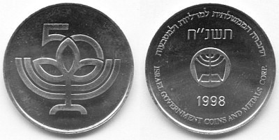 Israel's 50th Anniversary of Independence is commemorated on the 5758/1998 Season's Greetings token. Depicted on its obverse is a Menorah, out of which rise olive leaves and the stylized number 50. |