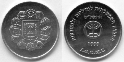 The 5759/1999 Season's Greetings token depicts on its obverse the emblems of the Twelve Tribes of Israel. |