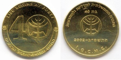 The Israel Government Coins and Medals Corporation celebrated its 40th Anniversary in 2002. The obverse of the 5762/2002 Season's Greetings token shows the number 40. The IGCMC logo is incorporated in the zero. The token was issued and mailed to IGCMC subscribers during August/September 2001, towards Rosh Hashanah (Jewish New Year) 5762. |