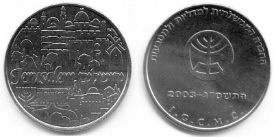 A stylized panoramic view of Jerusalem is depicted on the obverse of the 5763/2003 Season's Greetings token. |