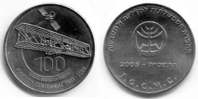 The 5765/2005 Season's Greetings token commemorates (two years late?) 100 years of aviation. The token's obverse depicts a biplane as used by the Wright brothers during their historic first flight in 1903, and a modern-day satellite. |