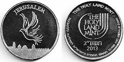 The 5773/2013 Season's Greetings token depicts on its obverse a dove, flying above the Jerusalem skyline. The token was issued and mailed to ICMC subscribers during November/December 2012, towards the civil New Year 2013 (Hebrew year 5773). *The Holy Land Mint is the minting facility of the Israel Coins and Medals Corporation (ICMC). |