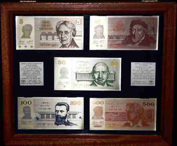 Sheqel series 1 Sheqel = 100 New Agorot Alloy: silver .925 Dimensions: 110 x 55 mm Average weight of each replica: 56.5 gr Quantity issued: 555 sets Reverse markings: State emblem, STATE OF ISRAEL, SILVER 925, ser. # xxx/555 |
