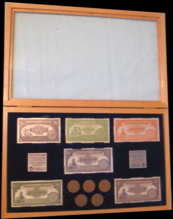 Complete set of x replica banknotes with identical serial numbers, in wooden custom display case |