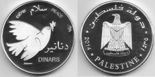 This coin (previously issued in 2010 AD / 1431 AH in varying sizes and alloys) depicts on its obverse a Peace Dove with an olive branch in its beak, drawn by Pablo Picasso, whose signature appears below. The Arabic word SALAAM is flanked by SHALOM in Hebrew and PEACE in English. A significant error is the missing digit 5 from the coin's obverse. The coin's reverse shows the Coat of Arms of the Palestinian Authority. The Arabic text near the top rim, as well at the base of the coat of arms reads: STATE OF PALESTINE. The year 1435 AH in Arabic numerals corresponds with the Gregorian year 2014. |