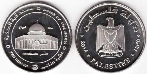 The coin depicts on its obverse the Dome of the Rock, the octagon-shaped, gold-domed mosque on the Temple Mount in Jerusalem. The dome is flanked by the words PATTERN in Arabic and ESSAI in Latin characters. Below the structure are the words JERUSALEM and AL-QUDS (Jerusalem in Arabic). The top circumference reads DOME OF THE ROCK and MASJID QUBBET ES_SAHRA (Mosque of the Dome of the Rock). On the bottom circumference is the face value in Arabic and English. At the bottom, within a cartwheel-shaped symbol, is the mintmark JL (initials of Joseph Lang, the US designer). The coin's reverse shows the Coat of Arms of the Palestinian Authority. The Arabic text near the top rim, as well at the base of the coat of arms reads: STATE OF PALESTINE. The year 1435 AH in Arabic numerals corresponds with the Gregorian year 2014. |