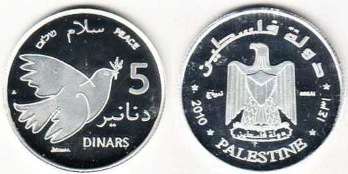The coin depicts on its obverse a Peace Dove with an olive branch in its beak, drawn by Pablo Picasso, whose signature appears below. The Arabic word SALAAM is flanked by SHALOM in Hebrew and PEACE in English. The mintmark JL (initials of Joseph Lang, the US designer) appears on the left. The coin's reverse shows the Coat of Arms of the Palestinian Authority. On the left is the word PATTERN in Arabic, and on the right ESSAI. The Arabic text near the top rim, as well at the base of the coat of arms reads: STATE OF PALESTINE. The year 1431 AH in Arabic numerals corresponds with the Gregorian year 2010. |